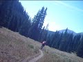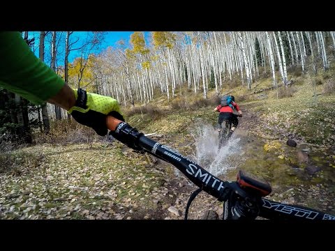 The top of the Whole Enchilada. After climbing to the top (part hike-a-bike), the downhill starts at treeline and is steep and loose. After some creek crossings in a softwood forest, you hit the aspens (golden in the fall) and thing s level out. This area is beautiful, but what's with those unexpected climbs? Great ride!