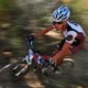 A cyclist riding through a blurred landscape on a dirt trail, surrounded by open fields and distant trees, creating a sense of motion and speed. Matthews Winters mountain bike trail.