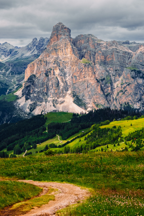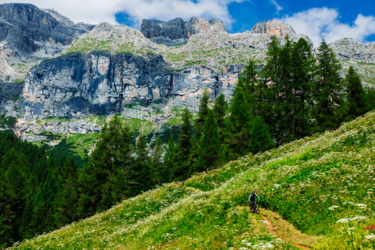 The Sellaronda MTB Loop is a 36-mile Dolomites highlight reel with an emphasis on iconic descents rather than lung-busting climbs—chairlifts do most of the work. This epic loop connects many of the region's best trails, from mellow flow trails to raw, root-strewn tracks that put Enduro World Series competitors to the test. Infinity, a three-mile, 2,300-foot descent from Passo Pordoi, alternates fast alpine chunder with steep banking turns before the trail enters a dense canopy of pines with suspension-sapping roots. On the east side of the loop, Flè (which means "flow" in the local Ladin language) traces long, loping curves through alpine meadows. Meanwhile, the Paravis and Easy Jump Trail at Selva di Val Gardena unspool like typical bermed bike park trails, only with the distraction of the Dolomites towering in every direction.