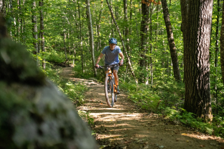 The brand-new Silver Moose trail is the critical connector between the two historic loops in the Moosalamoo. Completed in 2023 with an official ribbon cutting in May 2025, this beginner-rated trail sports a flowy, smooth trail tread rolling through the forest. Where Silver Moose rolls through flat terrain, the local builder, Lepesqueur & Daughters (aka L&D Trailworks), collected dirt locally to build up the trail tread and elevate it above the surrounding terrain. This trail design was critical due to the extremely wet soil in the area, which can remain muddy even into June after serious rain events, despite the elevated tread and side drain system.