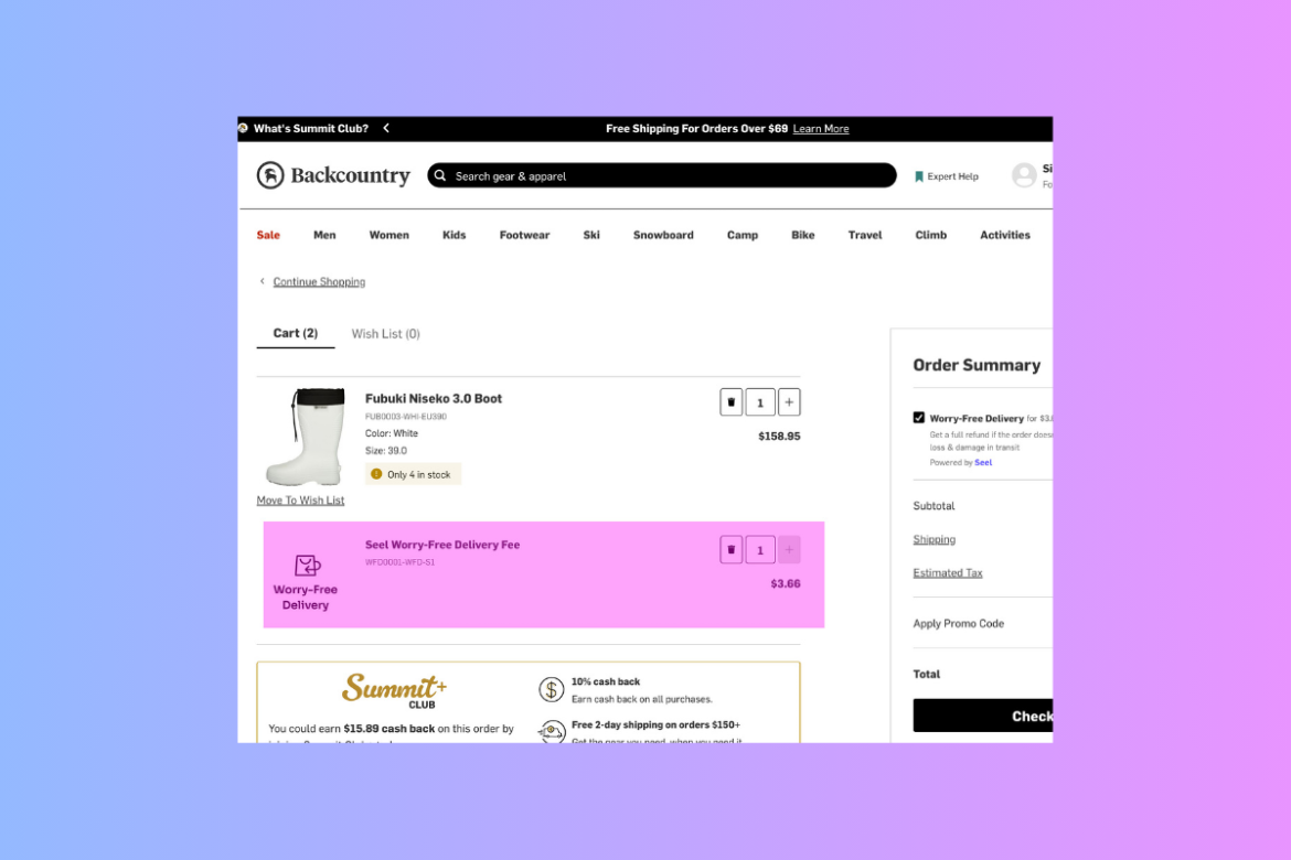 For example, Backcountry.com and other online retailers have partnered with a company called Seel to offer customers “Worry-Free Delivery” insurance with purchase. The fee, which is generally a few dollars and is calculated as a percentage of the purchase price, offers quick and easy refunds in the event of lost or damaged shipments. It’s automatically added to orders, though customers can remove the service from their cart (if they notice it before checking out).