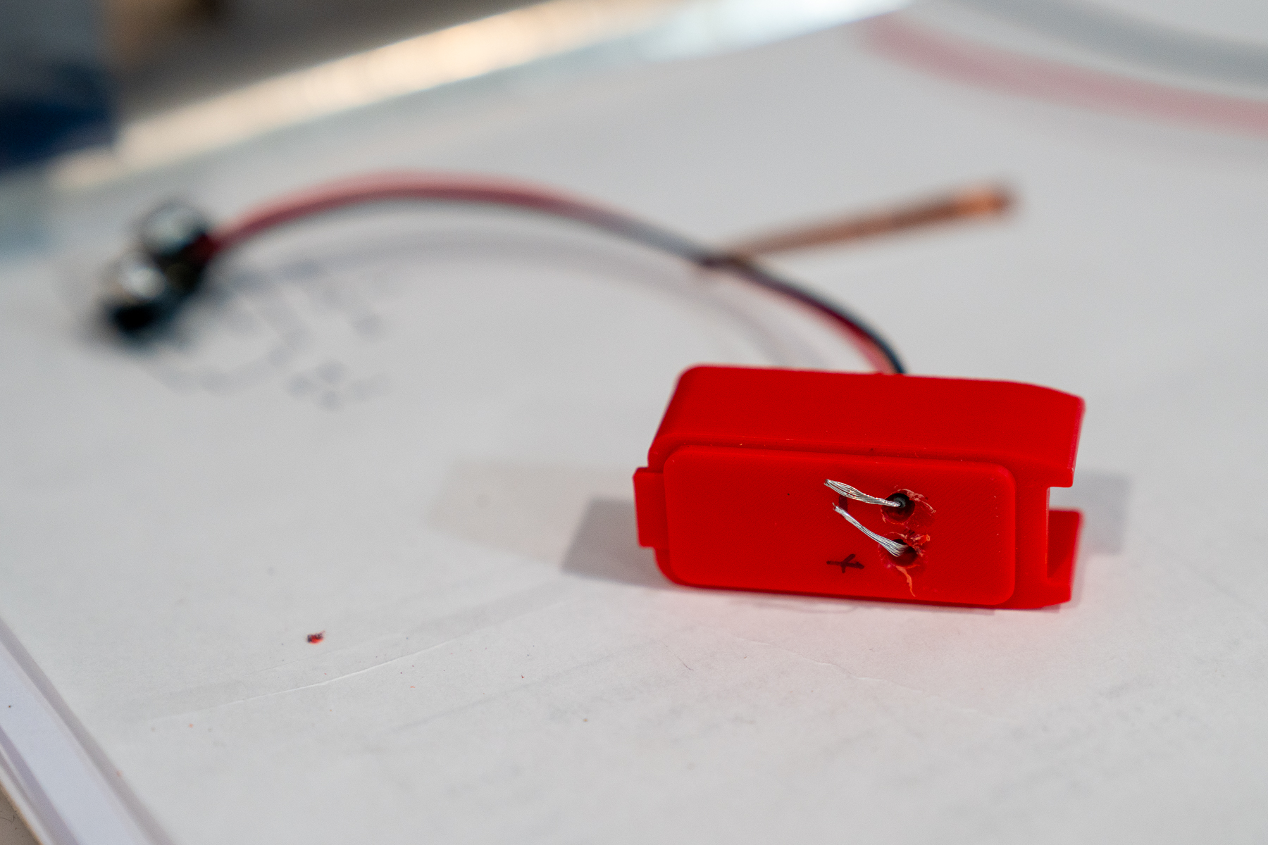 Even though I had proven it’s possible to power a SRAM AXS derailleur with a 9V battery, I wanted a more elegant solution. Well, more elegant than just holding the battery leads with my fingers. So I had my friend Borja 3D print a dummy SRAM battery, and I ran some wires through the top. I then added some conductive tape to contact the pins on the derailleur. The 3D print wasn’t perfect, and didn’t give a very tight fit, so I needed to add some more thickness to the conductive surface so it actually reached the pins.