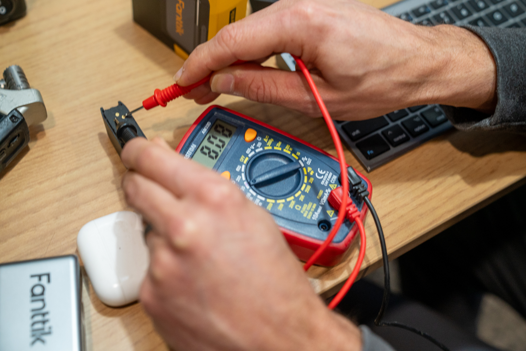 Back at home, I fired up my multimeter to see how much voltage an AXS battery delivers, and found a fully charged SRAM battery gives a touch over eight volts. I know nothing about electronics, but that seemed promising. I checked another AXS battery in my collection, a third-party battery from “Mazzmasy,” and the voltage, 7.4V, was helpfully printed on the case.
