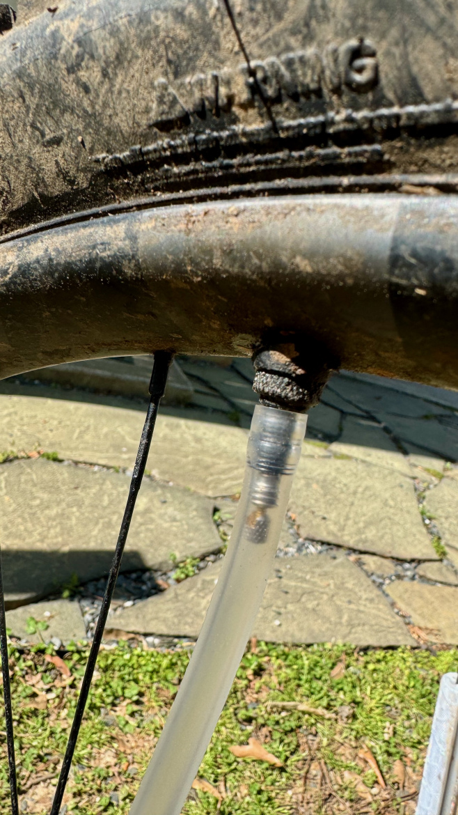Ultimately, I decided to set up a test in my backyard, and it’s a good thing I did. I poked a hole in my tire about the size of a 16d nail, and set about inflating the tire with GÜP. Initially, things did not go as planned.