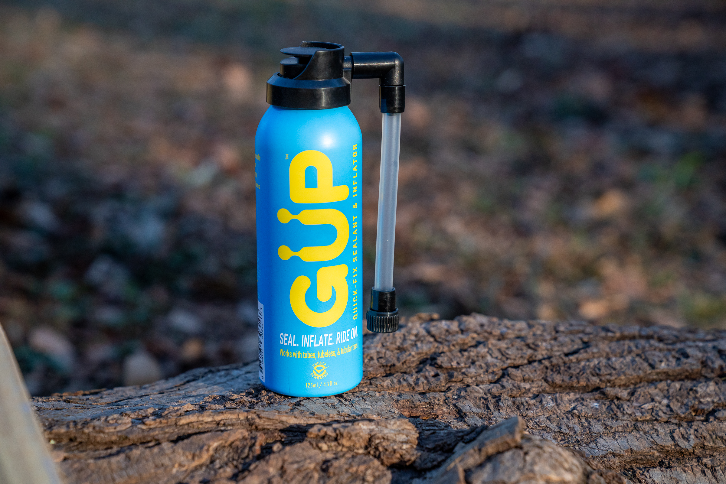 GÜP combines bike tire sealant and compressed air in a 125ml canister that features a trigger and nozzle. It’s a one-shot, single-use package that weighs about 4oz and is the size of a Lady Finger banana. Because GÜP is a compact and quick solution, it’s particularly attractive to enduro racers.