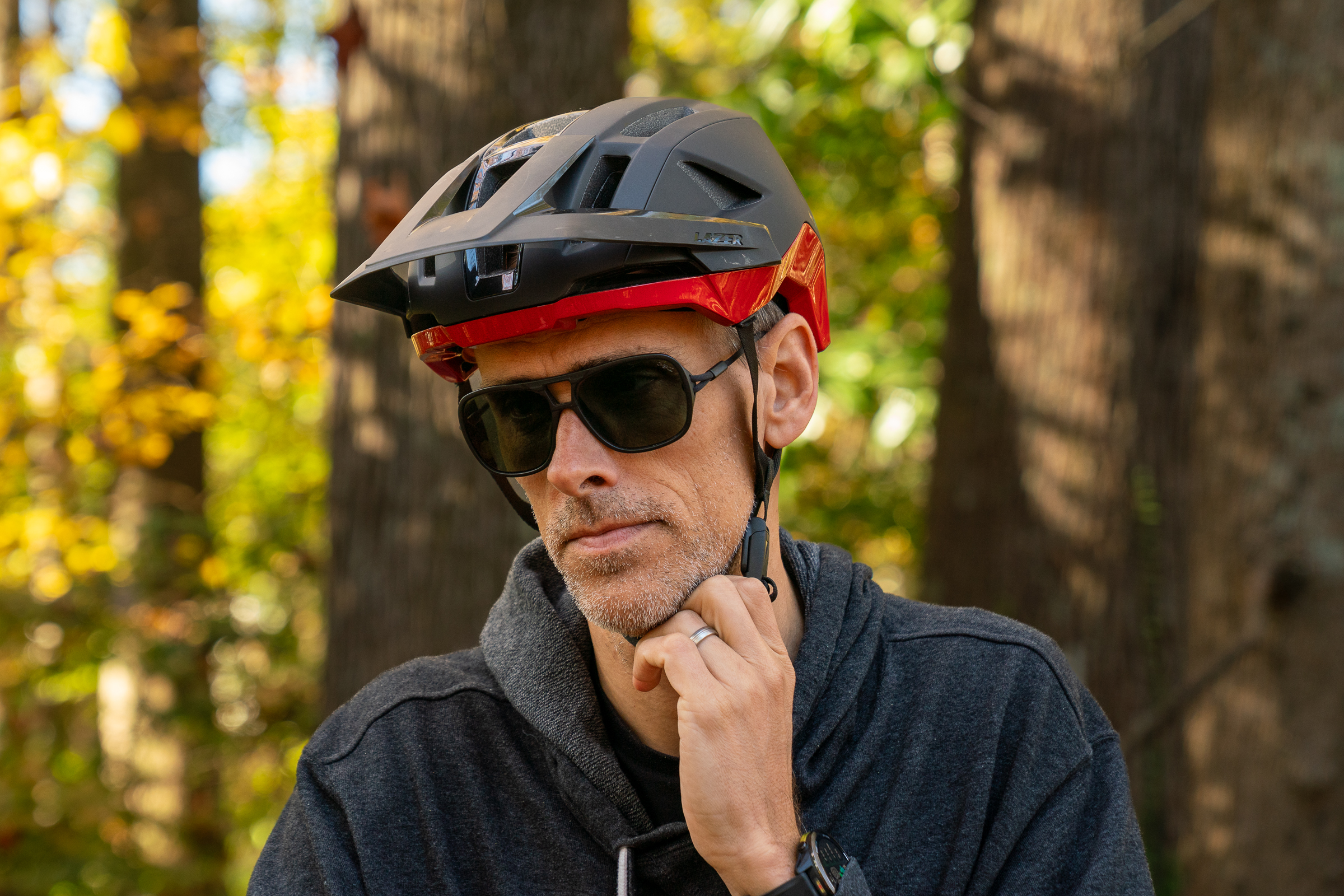 The three-position visor is designed to break away in the event of a crash, and though Lazer doesn’t tout eyewear storage, I found a couple of spots on the helmet that work for holding sunglasses. Around back, a textured panel is designed to keep a goggle strap in place.