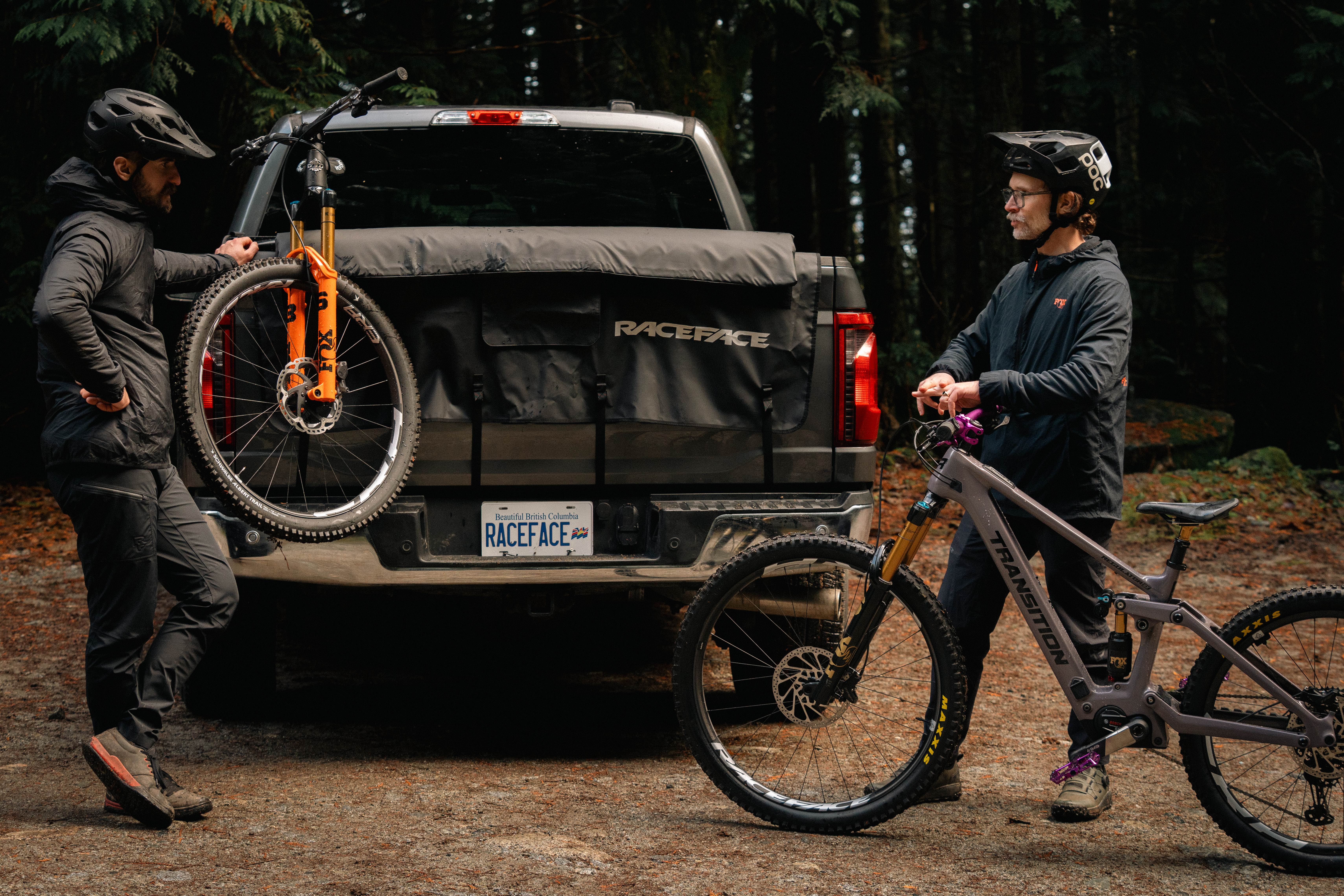 Two mountain bikers stand next to a pickup truck parked in a wooded area. One biker leans against the truck, which has a mountain bike with orange forks secured on its back. The other biker stands beside a gray mountain bike, holding it by the handlebars. Both wear helmets and casual outdoor clothing, and the surroundings are lush with trees and natural foliage.