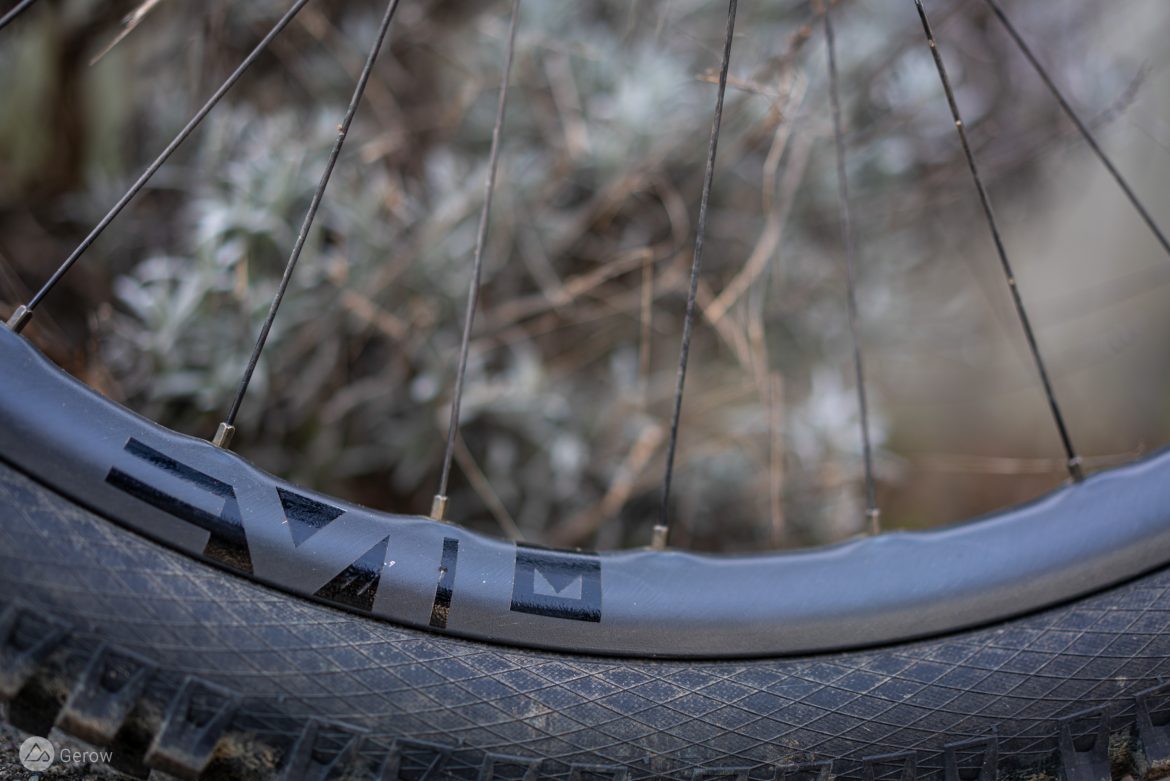 The rim, which is arguably the component on trial here, has a 29mm inner measurement that spreads tires out similarly to most modern gravity rims. The outer rim width is 36.4mm, providing a fat rim wall that hasn’t sliced through any of my tires to date, and the rim height of 23.2mm likely allows for some of these wheels’ notable impact absorption in the radial direction. Each of the thirty-two spoke holes is reinforced, and Evil says “reinforced spoke bosses boast greater than 950lb pull-through force. That’s a full 15% improvement over non-reinforced spoke faces.” I haven’t had a spoke pull through in a few seasons, and it seems with these that may never be an issue. Reserve and WTB both have carbon gravity wheels that use a similar fortification, and hopefully, this trend will continue throughout the carbon rim biz.