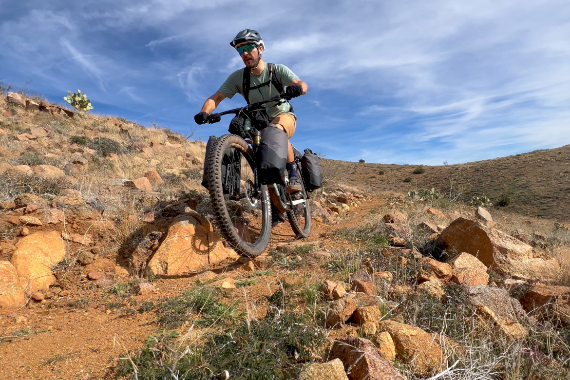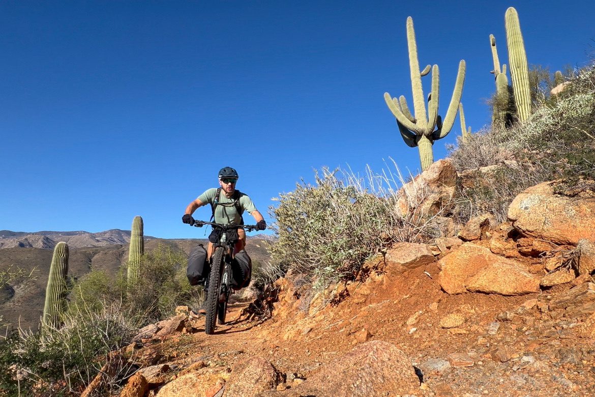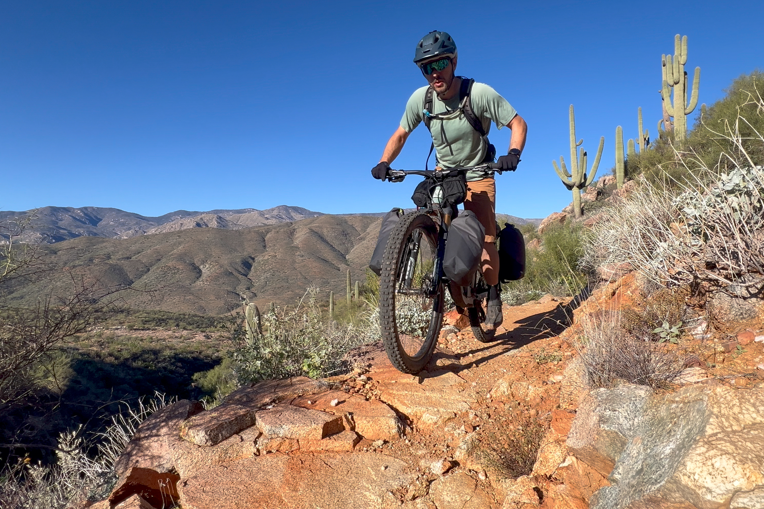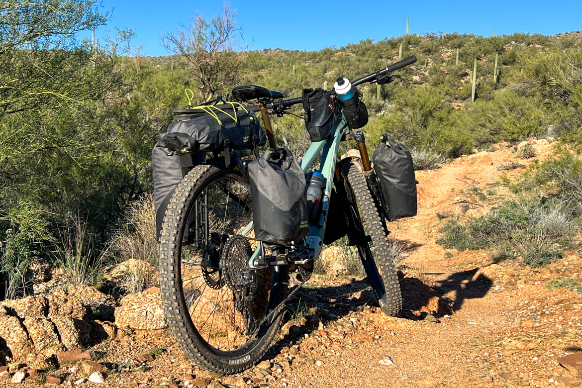 The momentum took another hit from the trail’s serious overgrowth. Since the Hemlock bags are mounted on the sides of the bike, they create a very wide profile. On a super narrow trail tread that was overhung with countless prickly pear cacti, cholla, mesquite bushes, sagebrush, and even the outstretched arms of saguaros, I spent most of two full days just dodging the poky things. Thankfully, the OMM dry bags are extremely robust, and they deflected countless thorny mesquite. I only stabbed one cactus spine straight into one of the bags; the rest of the desert, they deflected.