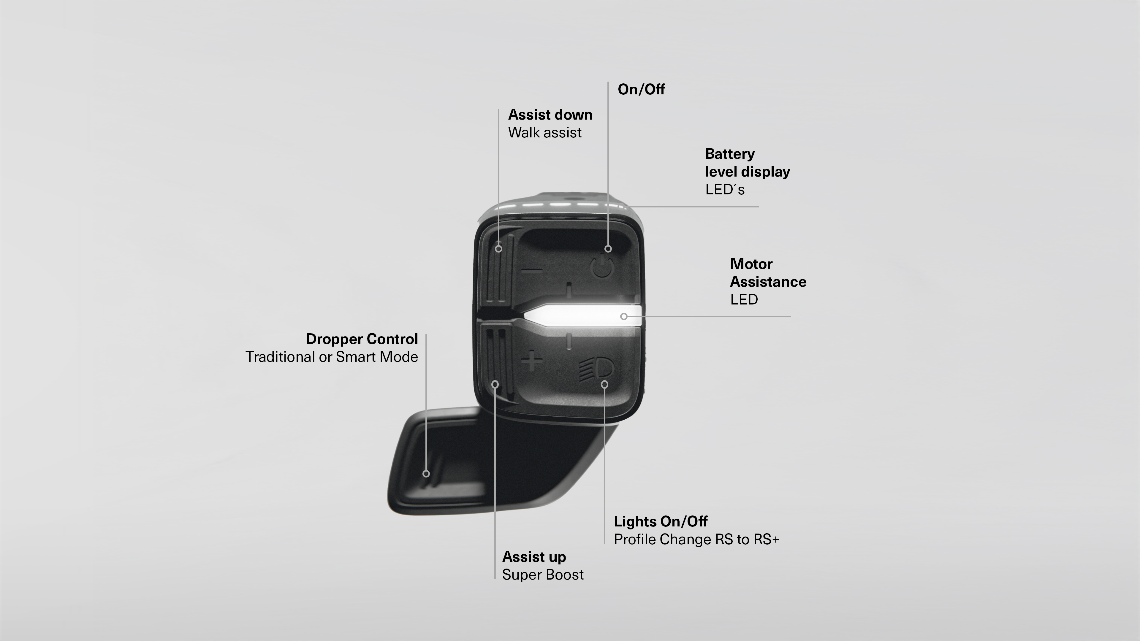 HMI. The remote can be used to adjust the assistance mode on an integrated Shimano EP8 motor, while an LED indicator is used to communicate both the battery level and the assistance mode.