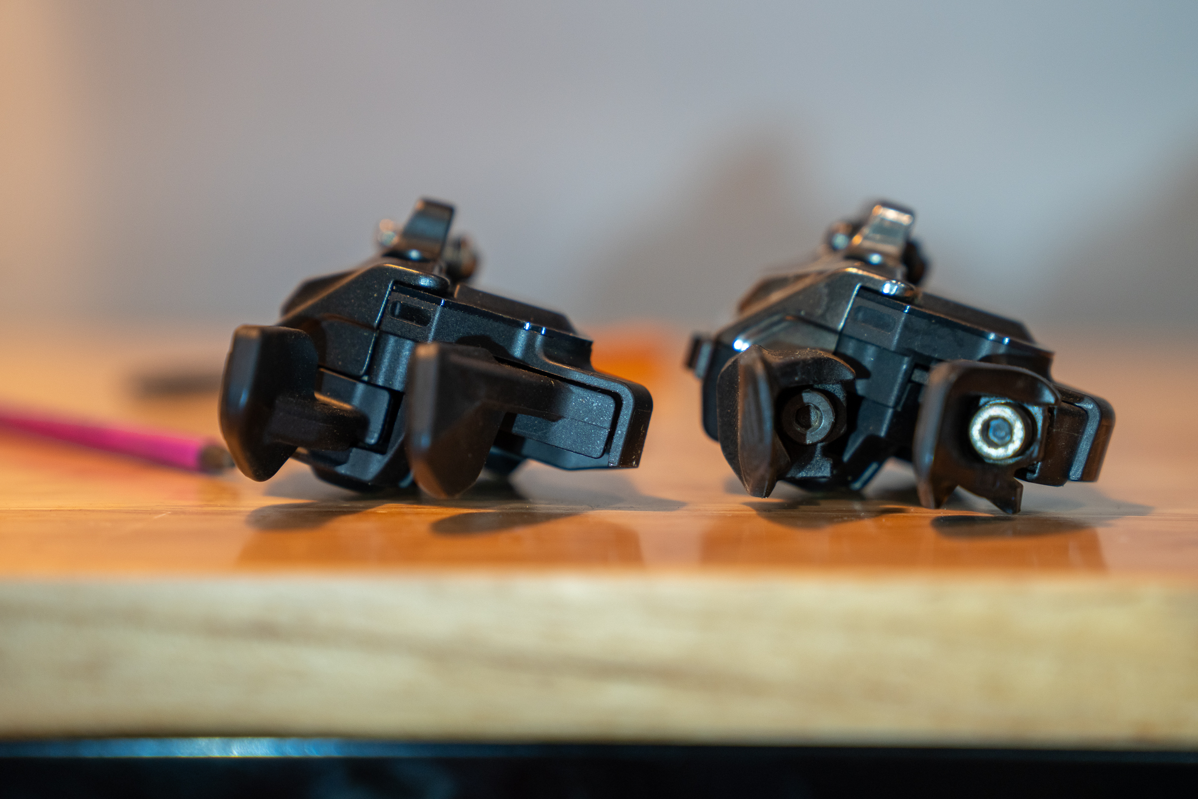 Like the other Di2 derailleurs, Deore doesn’t feature a clutch. Instead, the derailleur uses a dual-spring chain stabilizer. The stabilizer feels tighter on the Deore than my XTR derailleur, and a quick-and-dirty test with a fish scale shows it resists with about 10% more force. Of course, it’s quite possible that the springs inside the XTR derailleur — which I’ve been running for more than a year — have become stretched over time and have lost some of their spring tension.