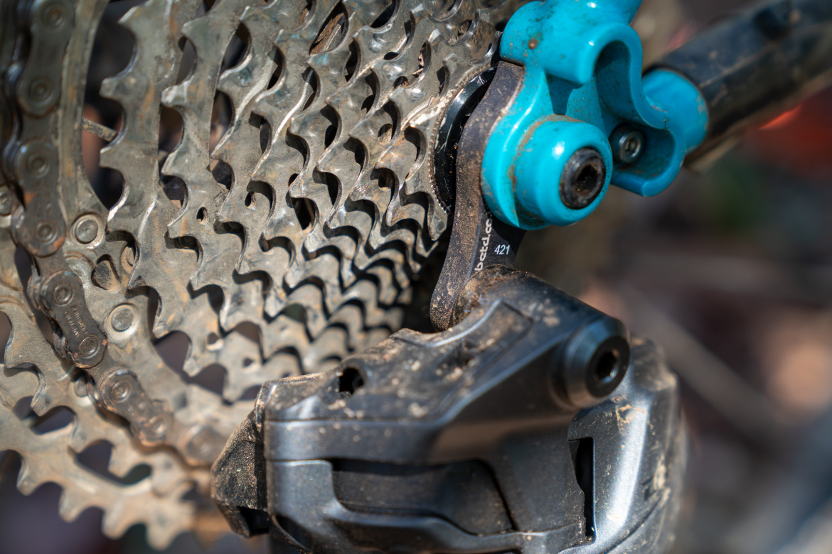 Right away, the derailleur shifted surprisingly smoothly, though I needed to make a couple of micro-adjustments using the trim function built into the derailleur. Shimano says the outer plate of the derailleur cage should align “with the tip of the tallest tooth on the largest sprocket” of the cassette. After adjusting the B-screw to its limit, my derailleur was still a couple of millimeters short of proper alignment. Ultimately, this didn’t affect my shifting over months of testing, though first gear does feel a little crunchy. (More on this later.)
