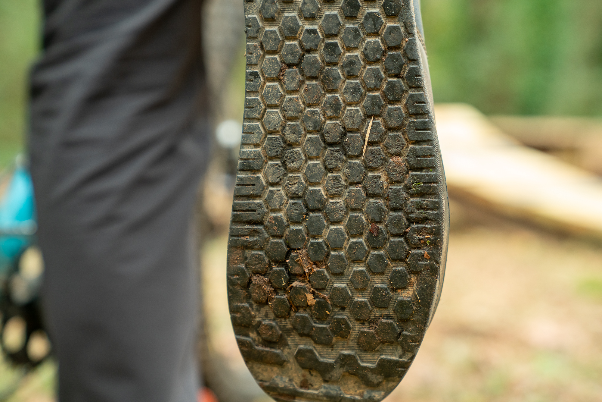 A raised inside heel adds ankle protection, which is great for riders like me with a stubbornly narrow stance that sees heels rubbing on the bike’s crank arms. The toe box has a bit of reinforcement as well, which has proven effective at blunting the pain of running toe-first into rocks and roots.