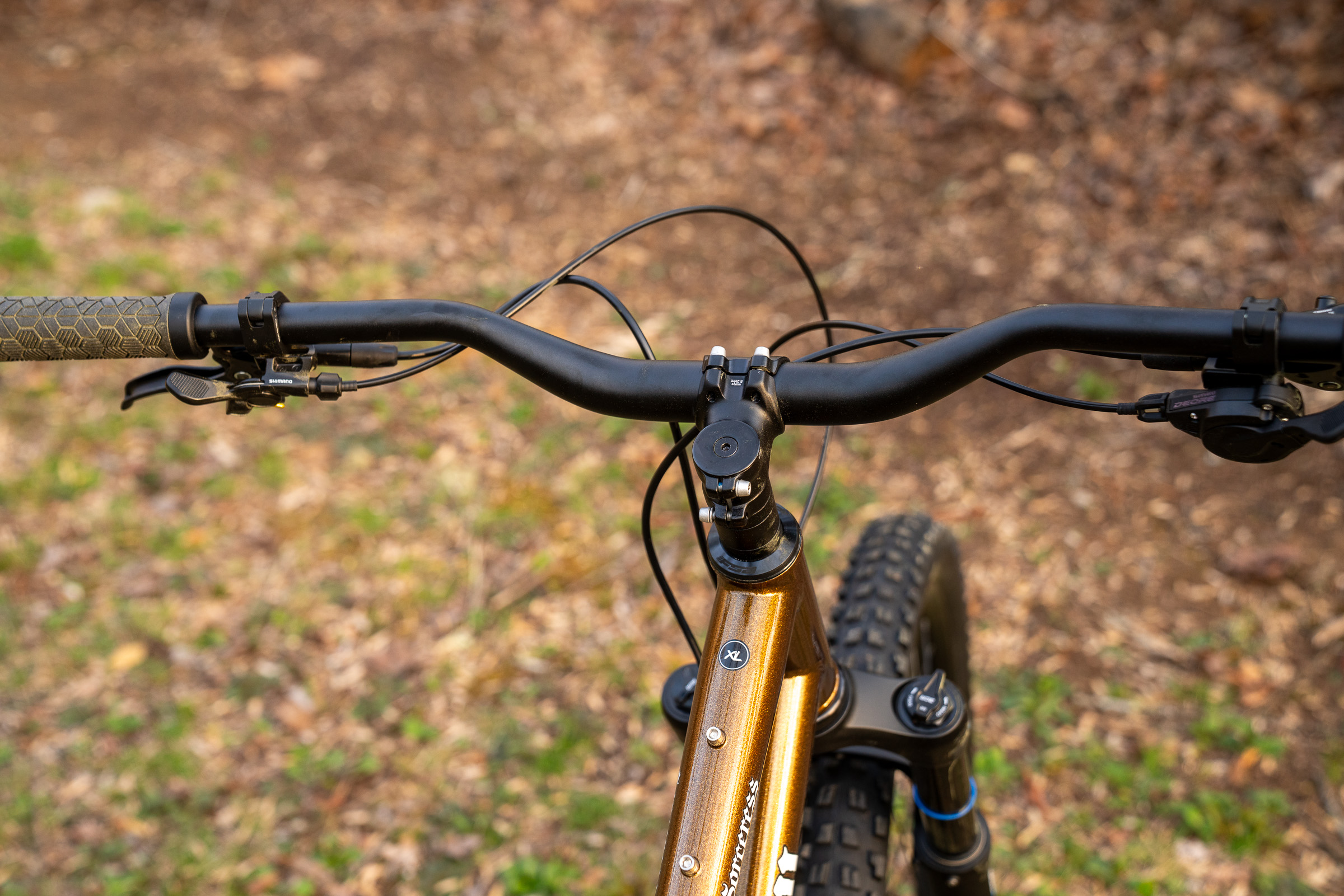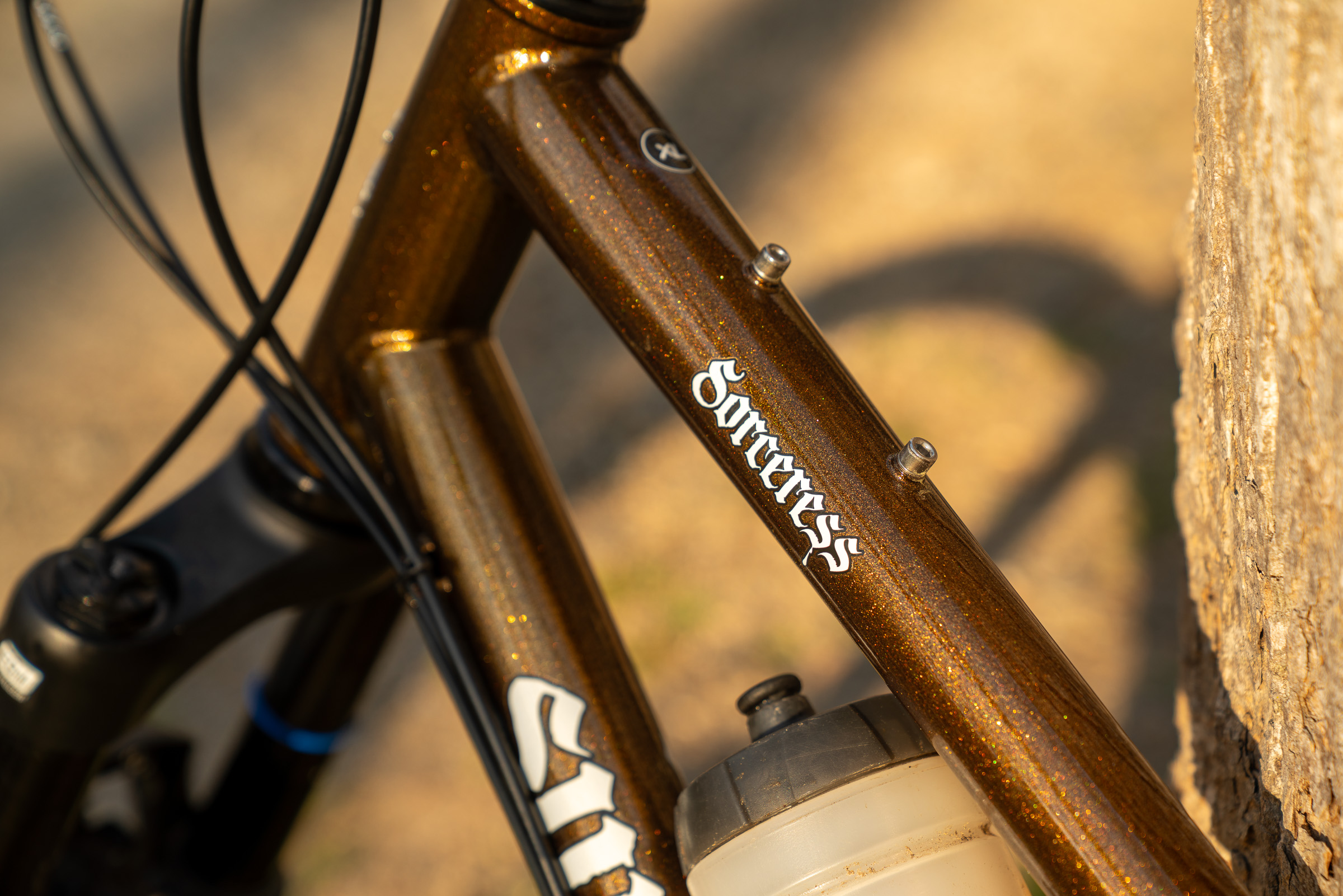 The Sorceress is nice and quiet on the trail thanks to simple external cable routing that ties everything together nice and tight. The Hot Honey Bling finish on the Shimano Deore build literally sparkles, though in the shade, the bike has a dull, copper look that’s classy and understated. Trumpet-flared tubes give the bike a unique silhouette that accentuates the straight line formed by the top tube and seat stays running from the top tube to the rear axle.