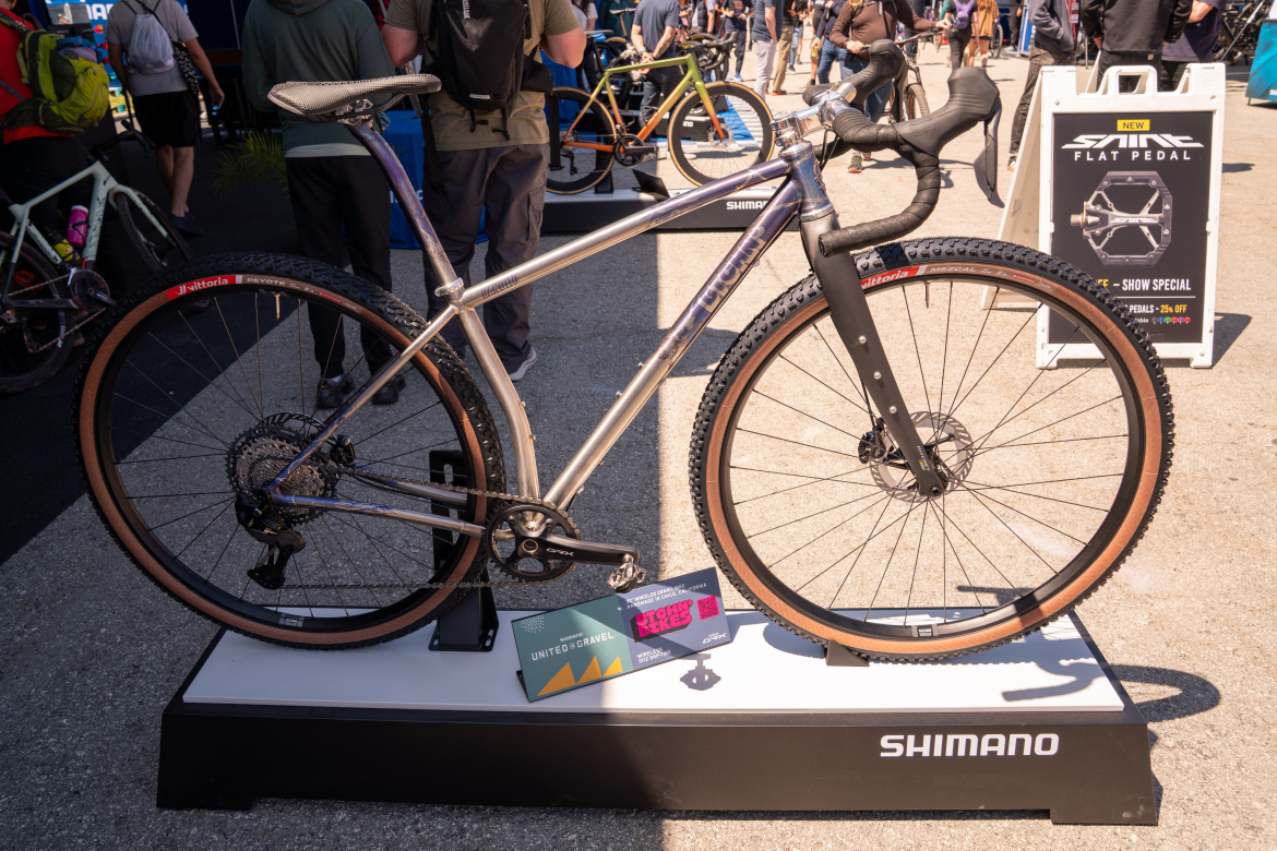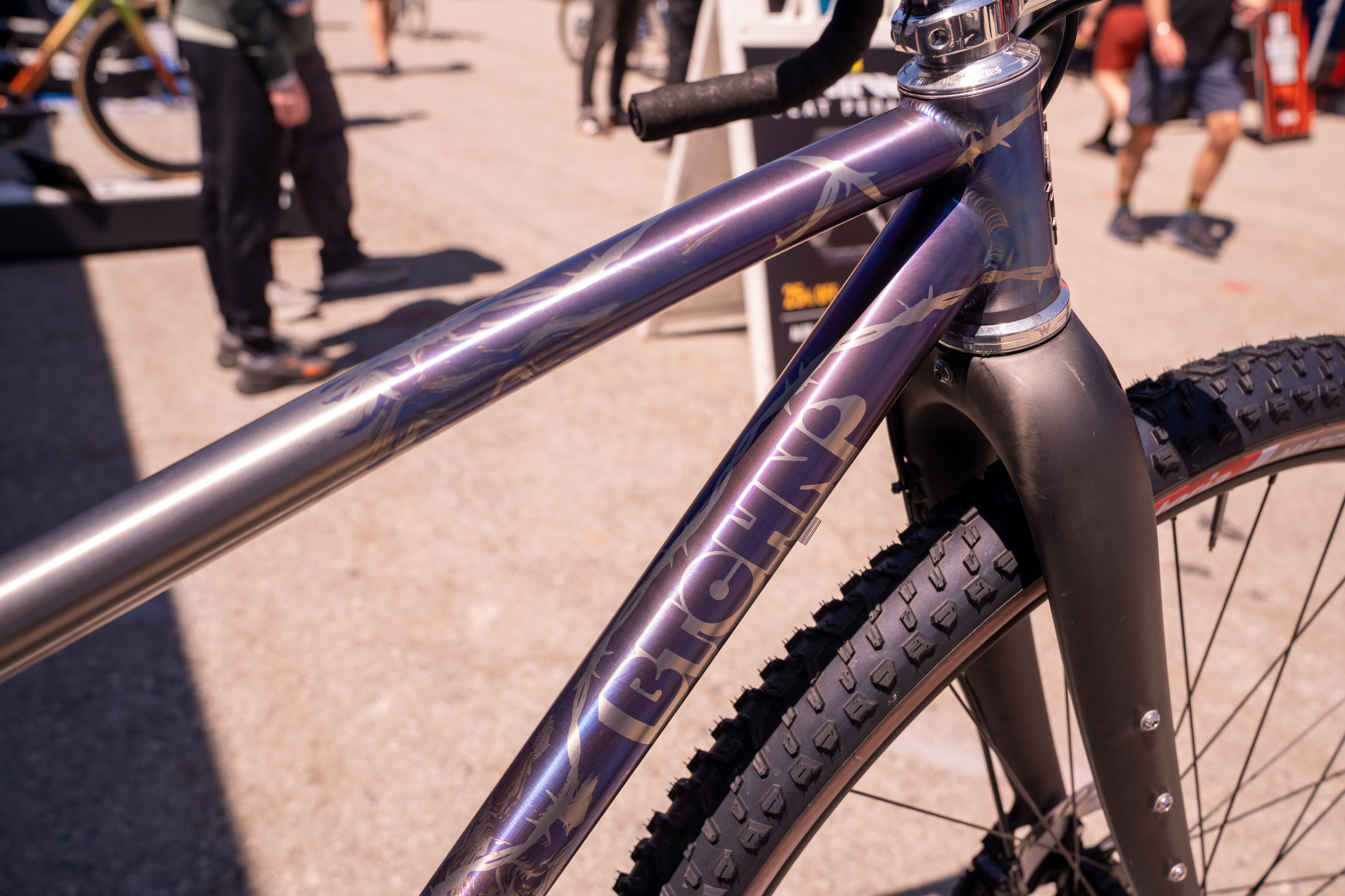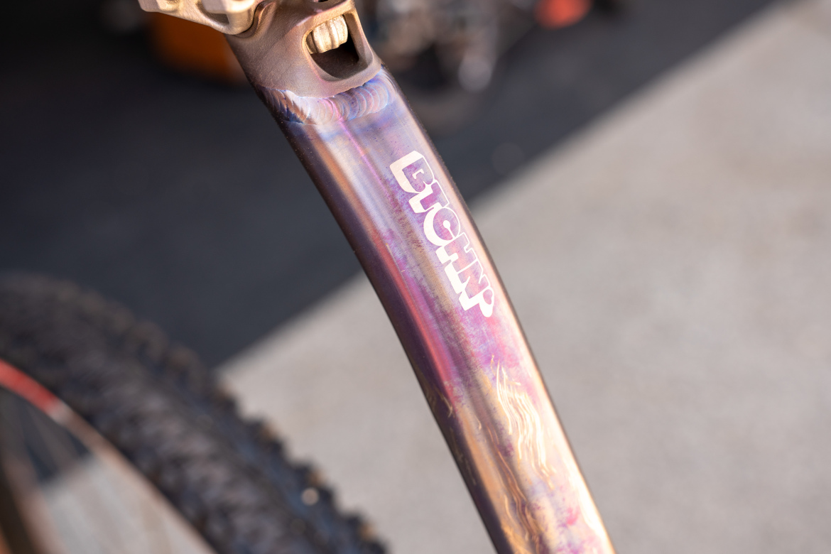 Greg had his eyes peeled for every 32er at Sea Otter, and the Btchn’ Bandito took the award for the most gorgeous drop-bar 32″ offering. The Bandito isn’t yet listed for sale on the Btchn’ website, so details are scarce. But the bike on display here appears to offer a titanium frame paired with a rigid carbon Ritchey fork with gorgeous purple flame graphics anodized directly on the titanium.