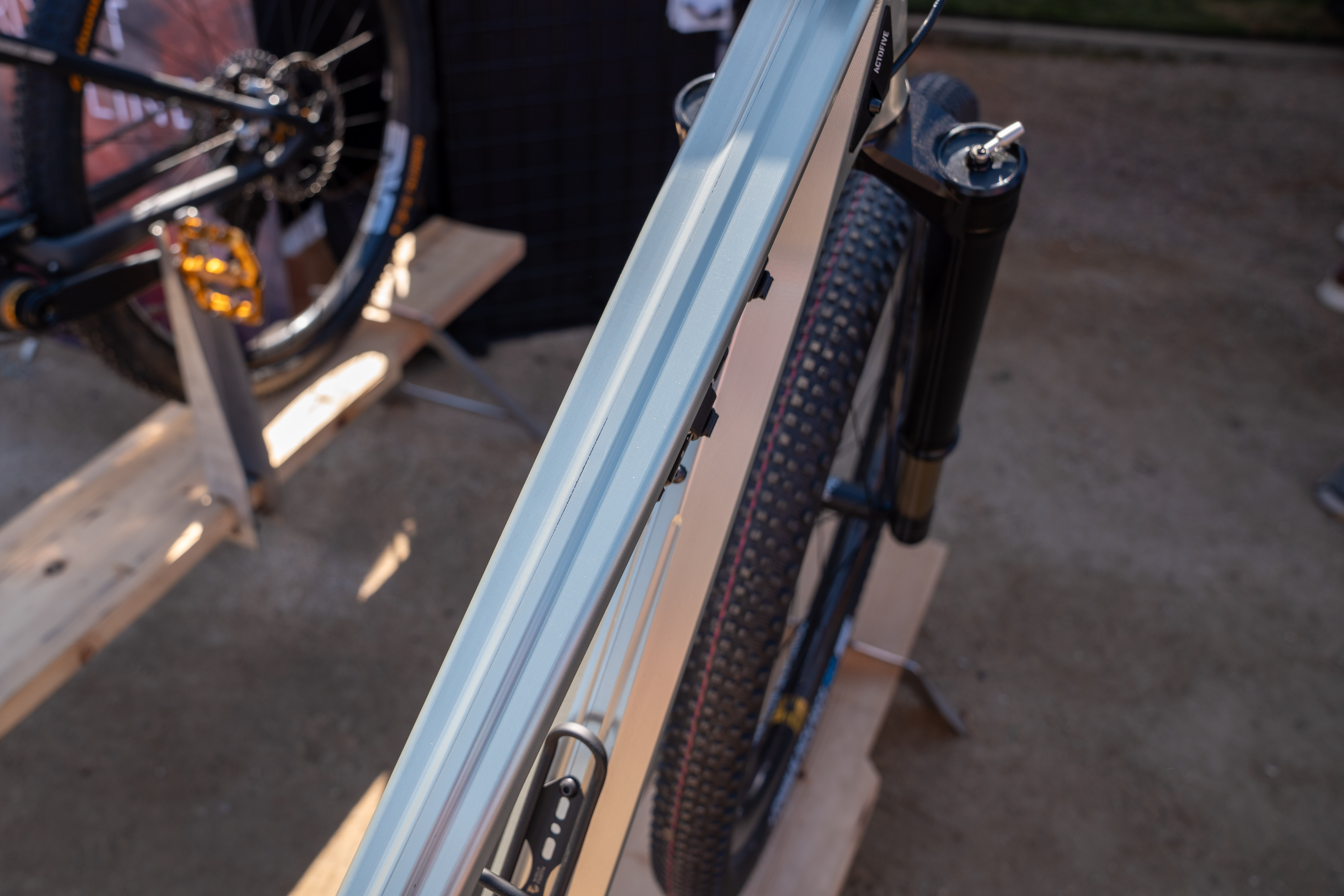 One of the most intriguing bikes Greg spotted at Sea Otter this year was this 32er I-Train prototype from Actofive. This gorgeous frame is made of bonded CNC-machined aluminum, meaning that the frame is constructed in two halves that are essentially glued together. This machining technique allows Actofive to craft endless intricacies into the frame. Looking closely reveals that the tubing has ridges and unique shapes to it, including recesses for cable routing. The bike sports 120mm of rear travel and 130mm of front travel, with a claimed weight of less than 30lb.
