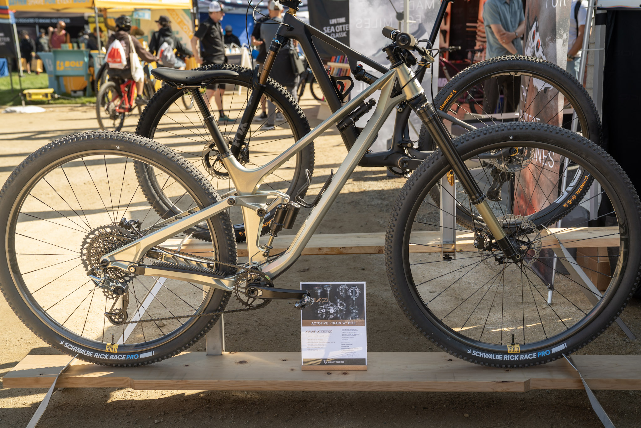 The build kit is fully custom, with MarkZero components including ALT XC pedals, external rotor lockrings, seatpost clamp, headset, and top cap. Eagle-eyed readers will also spot the blingy Madrone rear derailleur, plus Morse Ti bottle cage, Encase pump, Resolve dropper post, Berd Hawk30 Gold wheels, Intend suspension and brakes, and Schwalbe Rick Race XC 32″ tires.