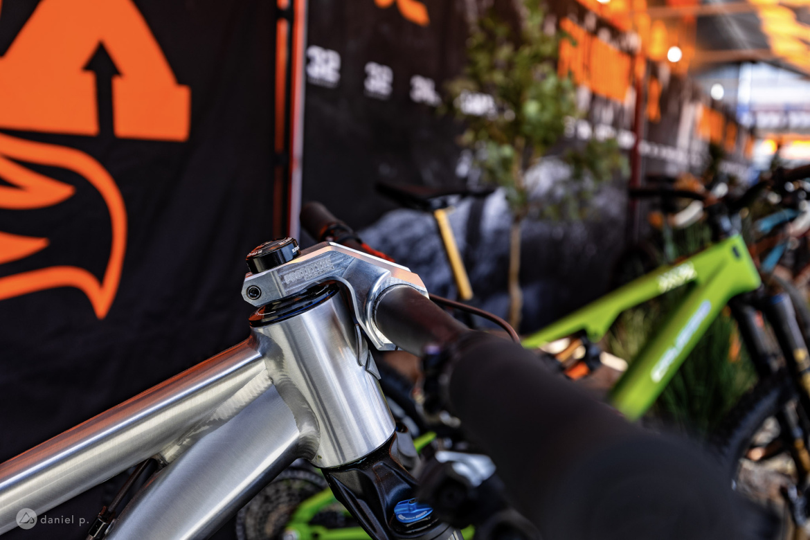 As brands and builders experiment with 32-inch bikes, they’re working to solve fit challenges along the way. This Race Face stem wasn’t the only negative rise stem we saw at Sea Otter, but it’s certainly one of the most striking. A negative rise stem can help compensate for a bike’s higher front end.