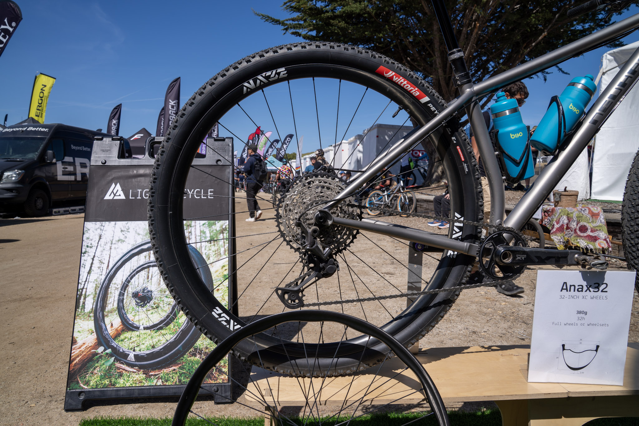 These carbon-rimmed wheels were announced back in February, and Light Bicycle had them on display at Sea Otter last week. The Anax32 rims are 30mm wide internally and are drilled for 32 spokes.