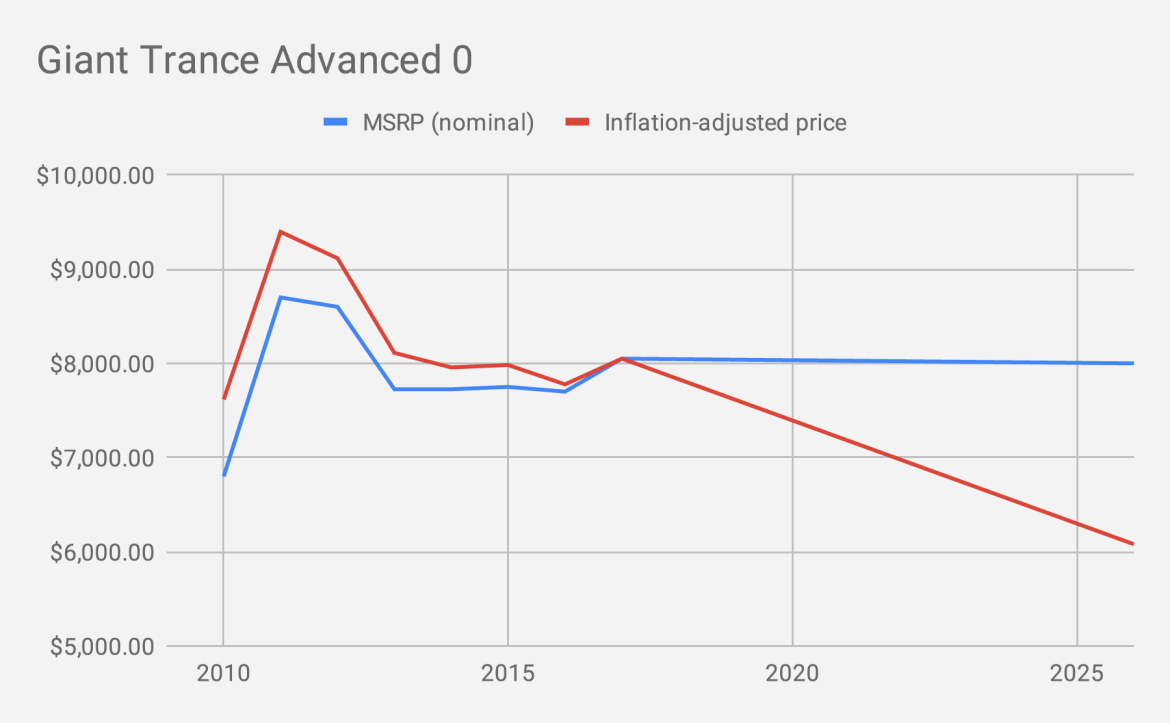 Among the majority of these that saw their inflation-adjusted prices decline, the Giant Trance Advanced 0 saw the biggest decrease. Though the nominal price barely changed — the MSRP was $8,000 in 2017 and $8,050 in 2026 — today’s price is roughly equivalent to “just” $6,080 in 2017, nearly $2,000 less than the bike was actually priced then!