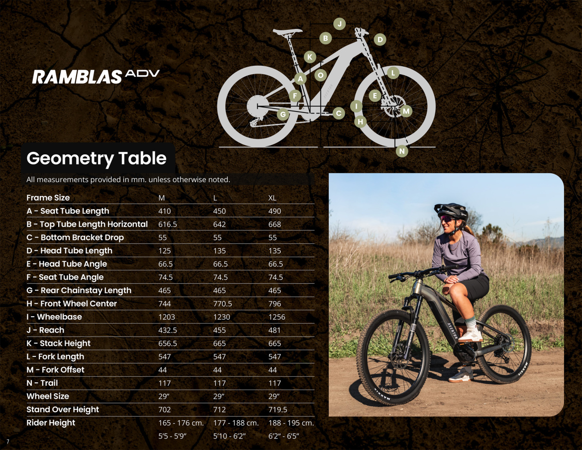 For the Ramblas ADV, Aventon is not offering size small bikes for riders shorter than 5’5″. The 66.5° head tube angle is pretty conservative, though not out of line for a hardtail with 130mm of travel. Reaches are fairly short across the board, while the 74.5° head tube angle is just half a degree off the average hardcore hardtail.