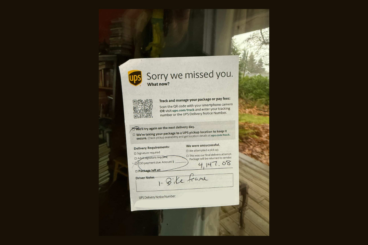 “[I] actually had the box in my hands yesterday, but they loaded it back on the truck,” Tiller told Singletracks in an Instagram message. Given the price of the bike and the origin of the frame, he estimates the correct amount should have been between $300 and $400. Tiller lives in Oregon and heads the Orogenesis Collective, a group that is working to map and promote a long-distance bike route from Washington State to Baja, Mexico.