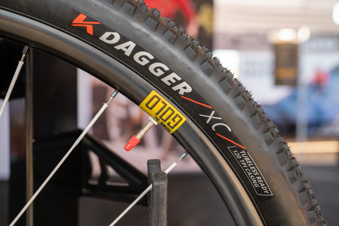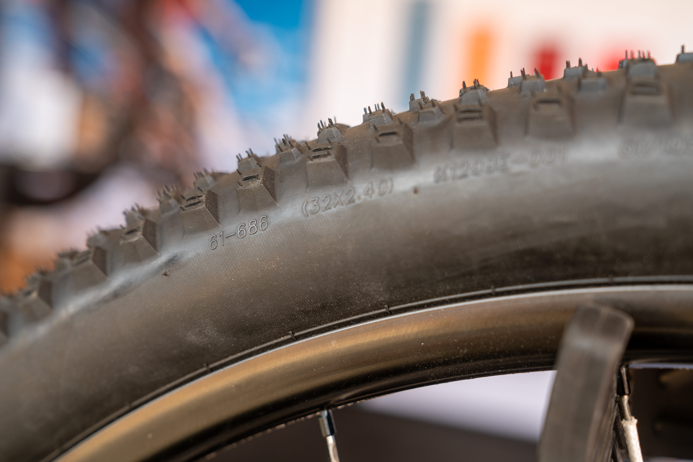 The Dagger is Kenda’s “ultimate cross-country and light trail tire,” and the brand is set to offer the tread in a 32×2.4″ size. Though the tire patch doesn’t scream 32 like some of the others we found on display at Sea Otter, if you look closely, you can see the specs molded into the tire.