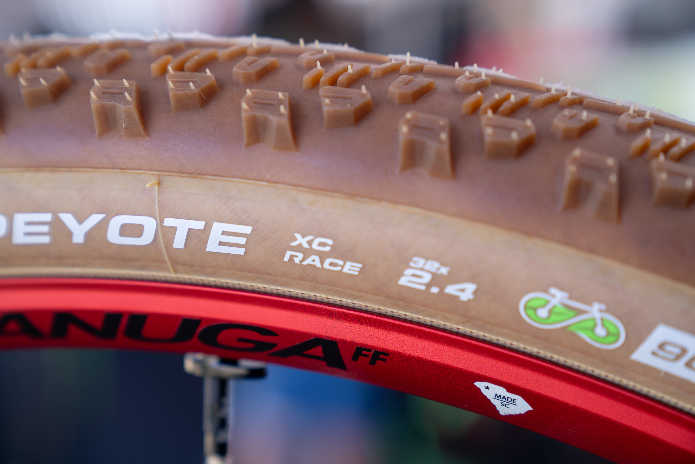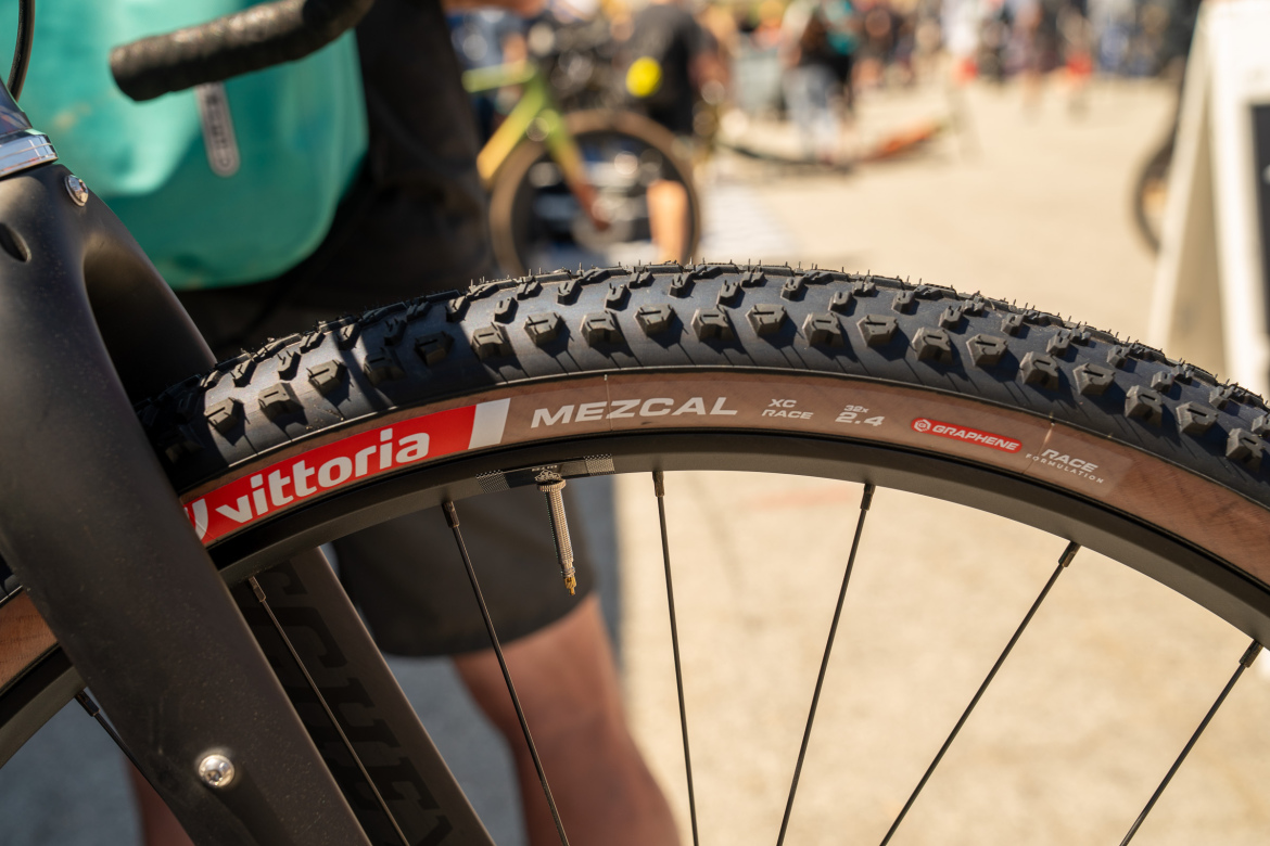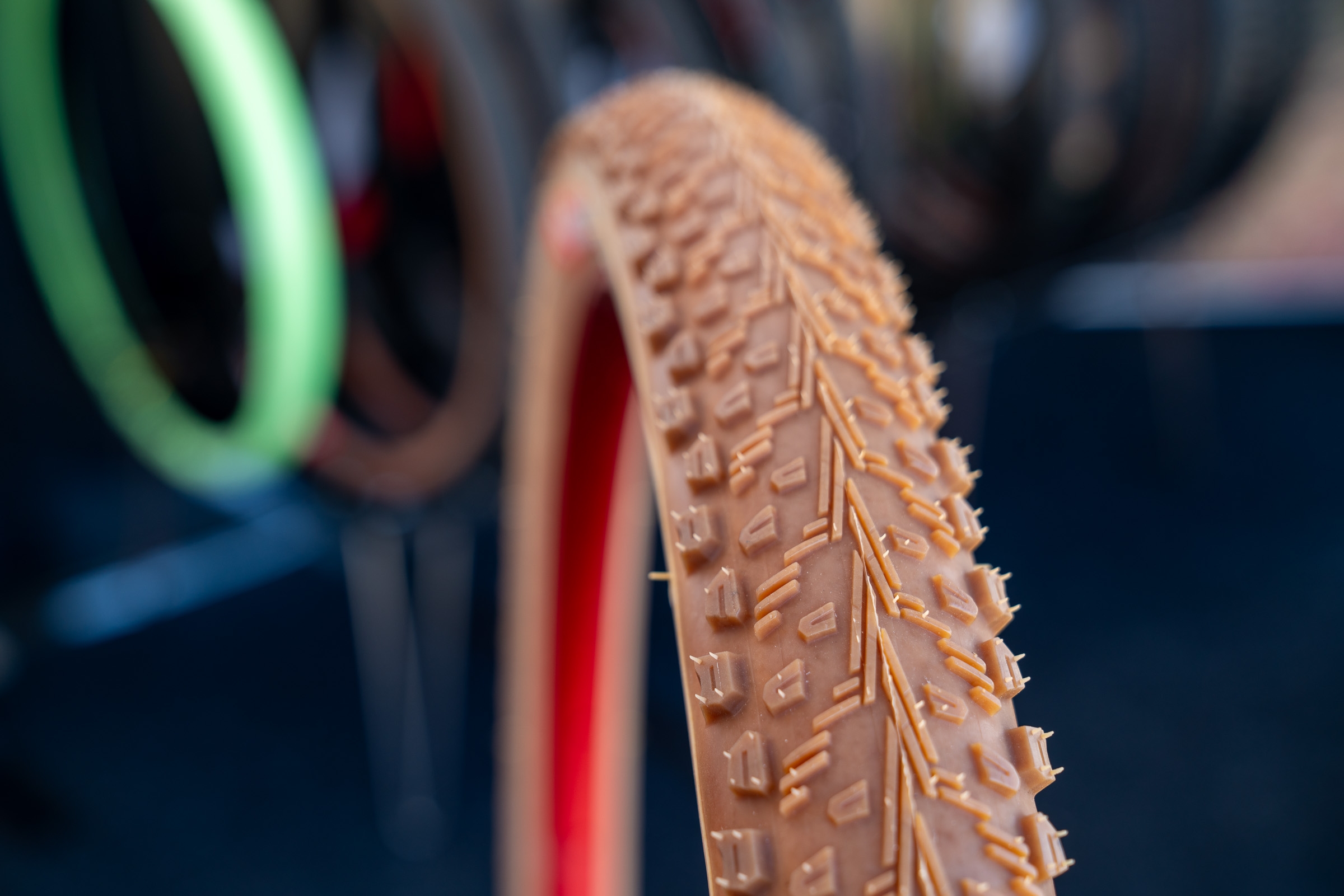 One of the Vittoria Peyote 32-inch tires we saw on display is the natural, brown rubber version shown above. Though we don’t have official weights for these new 32er tires, Vittoria’s natural rubber tires are generally about 20g lighter than their carbon-black counterparts.