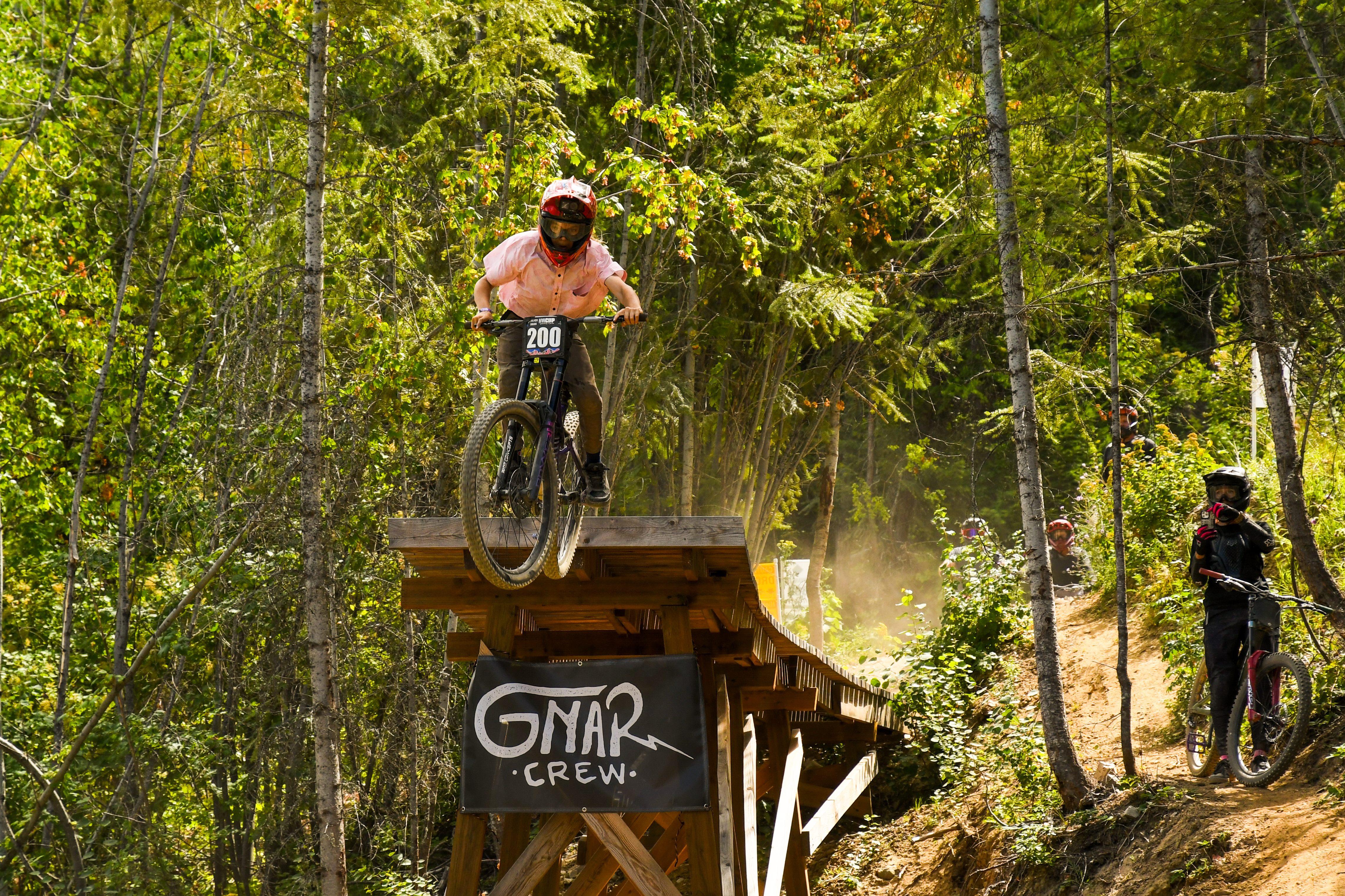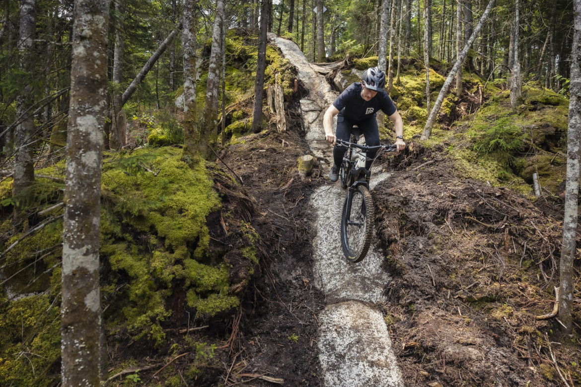 This investment has created a slew of top-tier trails that local riders are raving about, and B90 is one of the best. During the inaugural 2025 season, B90 was the toughest jump/freeride trail at PBR, quickly becoming a local favorite. B90 features four distinct sections. “The first section has a drop and then big tables,” explained Lance Kalbach, General Manager of PBR. “The second section is a little more technical, tighter, faster. It’s got a couple little sniper gaps here and there. It’s got a couple little step downs. Then the third section has shark fins, a hip on it. It’s got another little step down drop. Then it goes into the fourth section, which goes onto our wood feature. […] Then B90 has another drop into a section that has all kinds of stuff going on, from shark fins to step ups to step downs to more shark fins to a gap over a natural section where it wasn’t machined.”