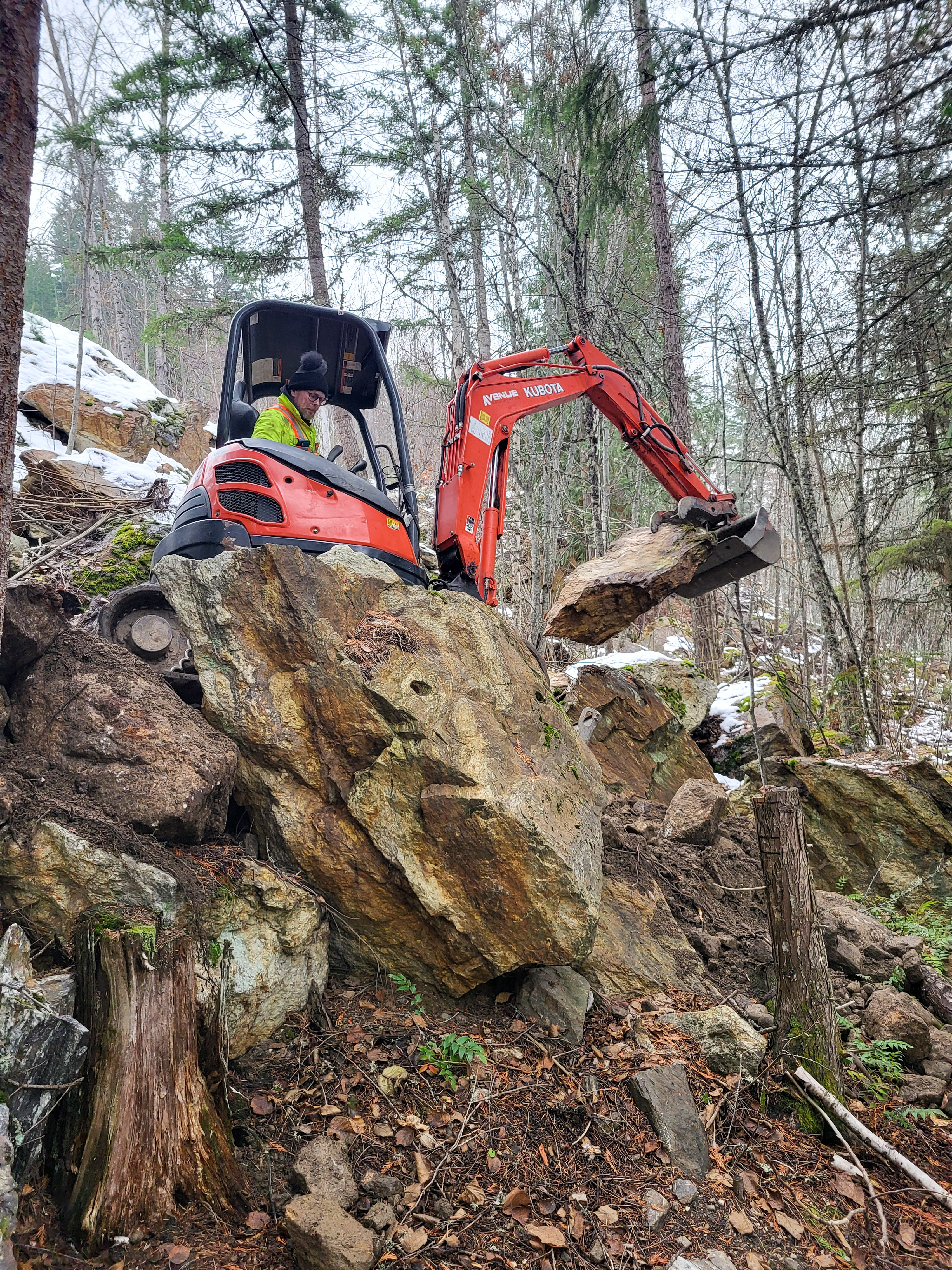 Phase one entailed the creation of a green climbing trail 2.8km (1.74mi) long and a blue downhill trail 1.2km (0.75mi) long. Almost immediately, Timmer saw there was a major challenge to building at the site. “There is an unbelievable amount of rock, and massive rocks too. There is so much rock there that there is little material left to build with.”