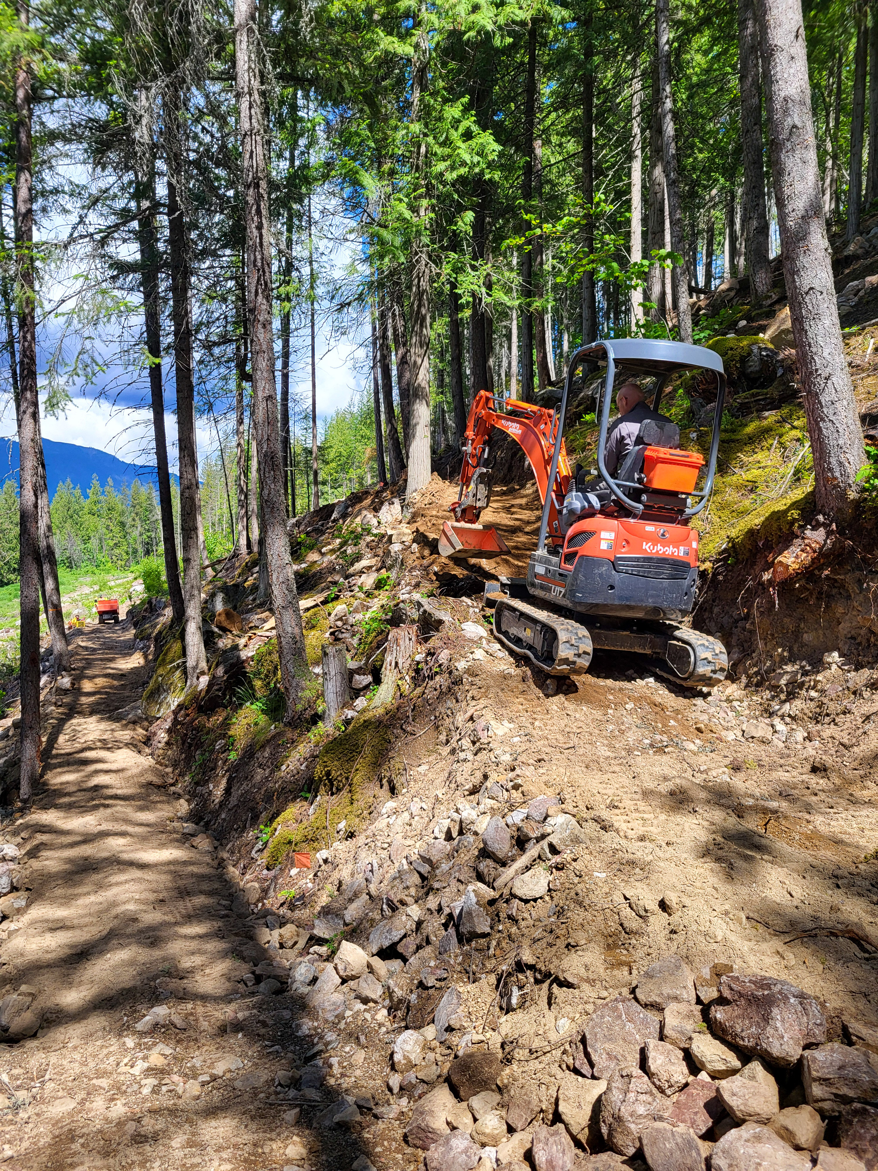 Bostock told Singletracks that new trail projects usually take about five years to be approved. Since the majority of BC is Crown land, approval for new trails must come from the land manager, Recreational Sites and Trails BC. Additionally, the Splatsin (pronounced Spla-jeen) First Nation also had to approve the project before any site work could begin because of the land’s cultural significance.