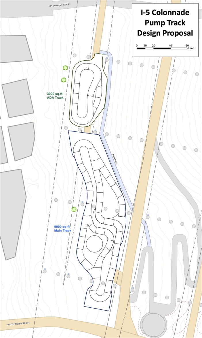 Evergreen will add over 9,000 square feet of pump tracks to the I-5 Colonnade Park in the coming months. And, if all goes according to plan, they hope to carry the momentum from the pump track project into some much-needed revitalization for the park.
